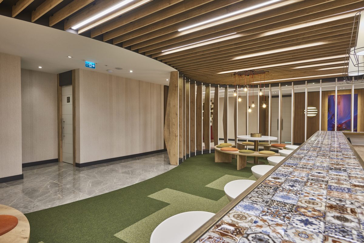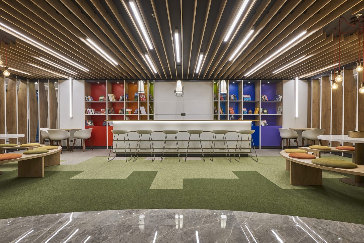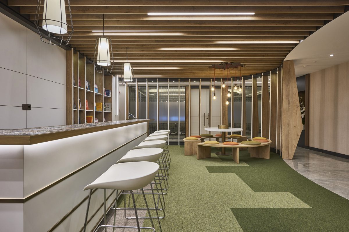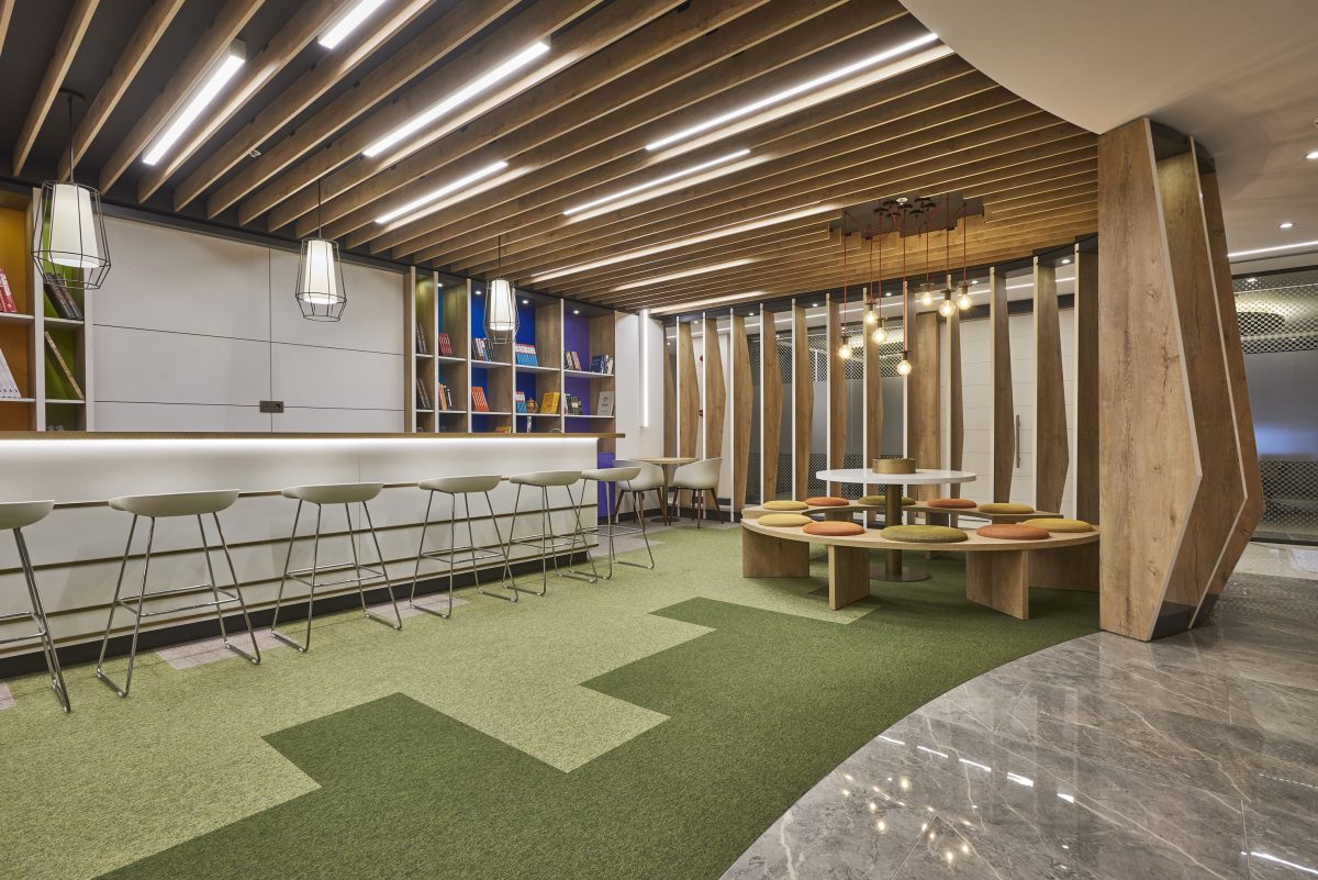 EDDA Mimarlık tarafından sosyal alanının odak noktası olarak belirlenmesiyle planlanan proje; seçilen malzeme, renk ve peyzaj tasarımları ile çalışan motivasyonunu pozitif yönde etkilemek üzere düzenlendi. Kullanılan malzemenin iç mekan konforuna, kalitesine ve dolayısıyla kullanıcısına etkisini analiz eden tasarımcılar IMAK OFSET projesinin zemininde ürün grubumuzda bulunan Interface koleksiyonlarına yer verdi.