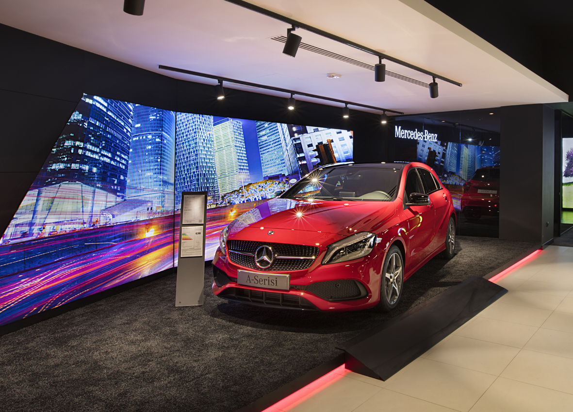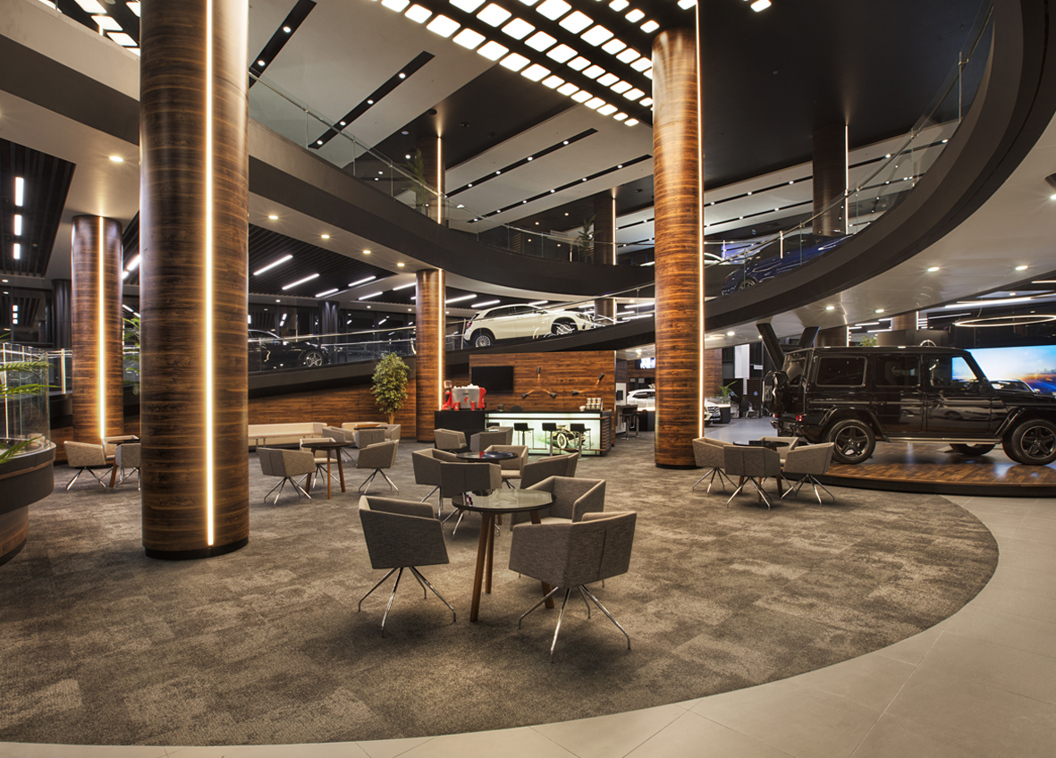 Mercedes showroomlarında Interface Composure karo halıları tercih edilerek hem dayanıklılık hem de estetik bir uyum sağlandı. Zemin tasarımı, markanın lüks ve zarafet algısını destekliyor. Proje, müşteri deneyimini zenginleştiren bir atmosfer sunuyor.