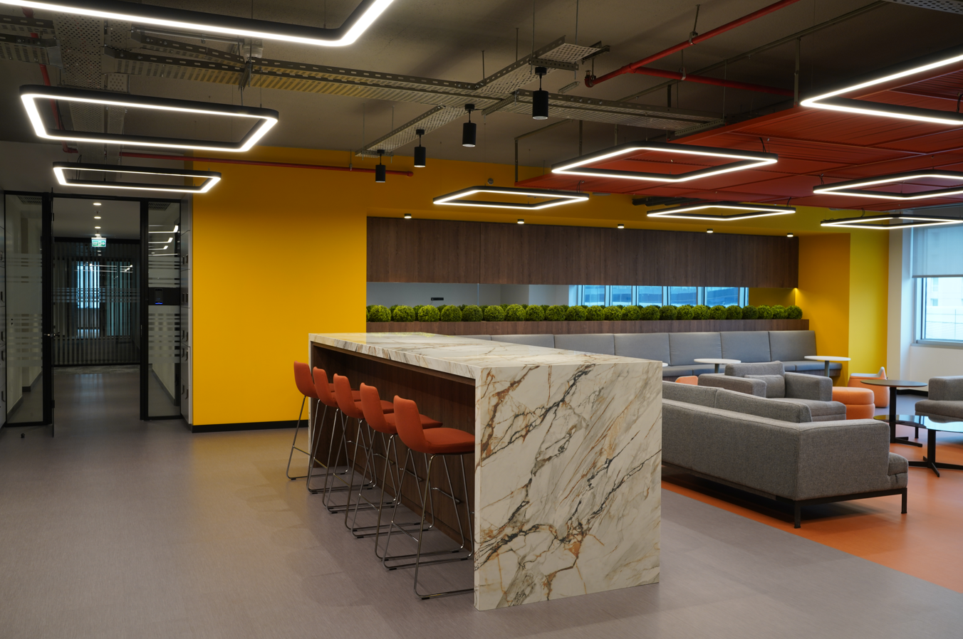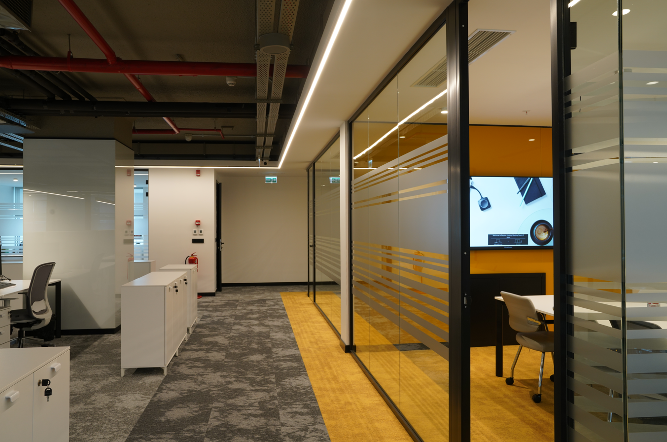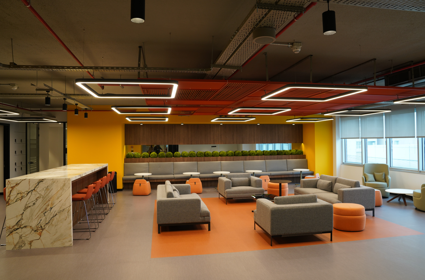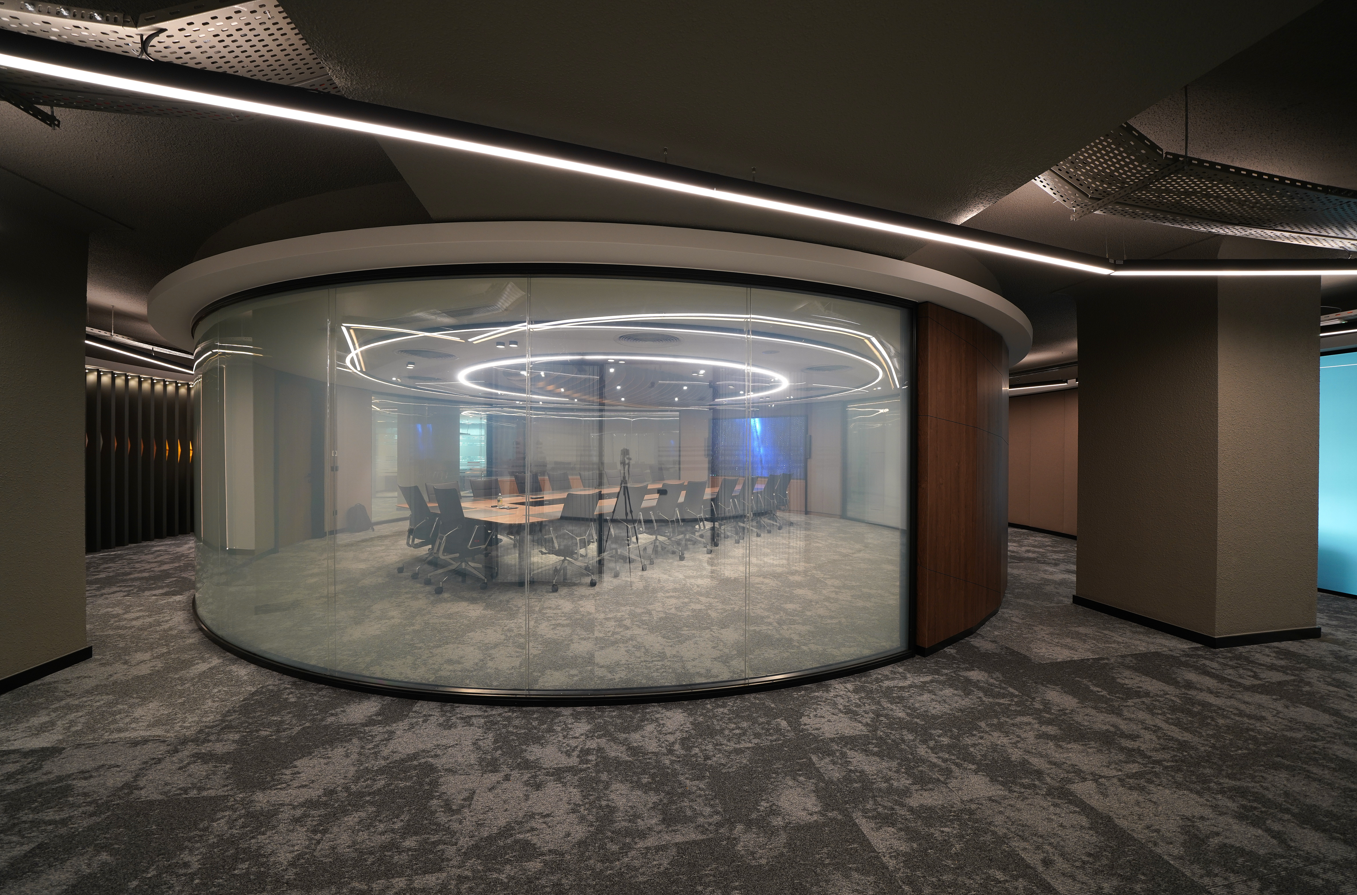 Proje kapsamında kullanılan LVT Brushed Lines koleksiyonu, çizgisel dokusuyla ofis içinde yön hissini destekleyen; yüzeyde sade, ancak karakteristik bir dil oluşturdu. Bu yüzey kurgusu, kullanıcı sirkülasyonunun yoğun olduğu alanlarda yönlendirme ve görsel süreklilik açısından etkili oldu. Brushed Lines ile birlikte yer verilen Connected Ethos karo halı serisi ise doğadan esinlenen ton geçişleri ve modüler formu sayesinde, bireysel çalışma alanlarının tanımlanmasında işlevsel bir katkı sundu. Zemin tasarımında bu iki ürünün birlikte kullanımı, açık planlı ofis kurgusunda farklı işlevlere sahip alanlar arasında görsel ve fonksiyonel bir bütünlük sağladı.